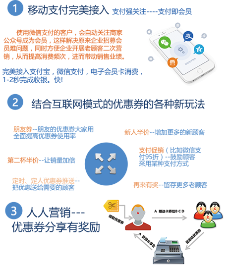 充分利用互联网营销方法留存消费客户,活化会员粉丝,通过支付强关注、优惠券、朋友券、人人营销券、回头客奖券、微信电子会员卡等强大营销功能,迅速留存并扩大顾客数量,提升店面业绩。